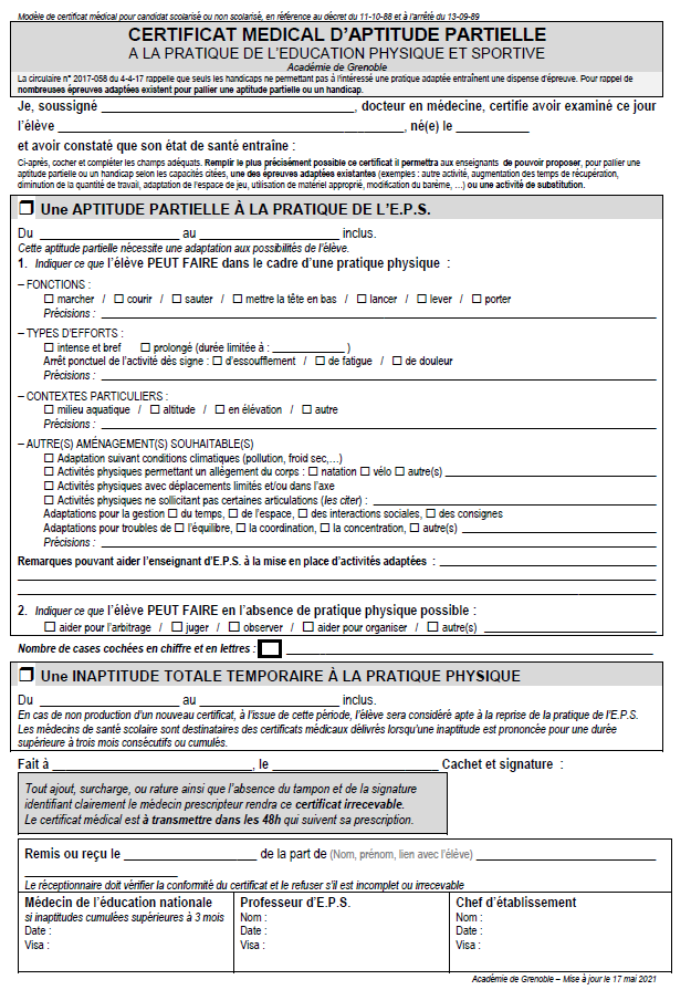 Toute incapacité à pratiquer une activité physique, devra être justifiée avant le cours soit par un mot des parents à propos d’une inaptitude à la pratique ponctuelle, soit par un certificat médical pour une inaptitude à la pratique de longue durée.